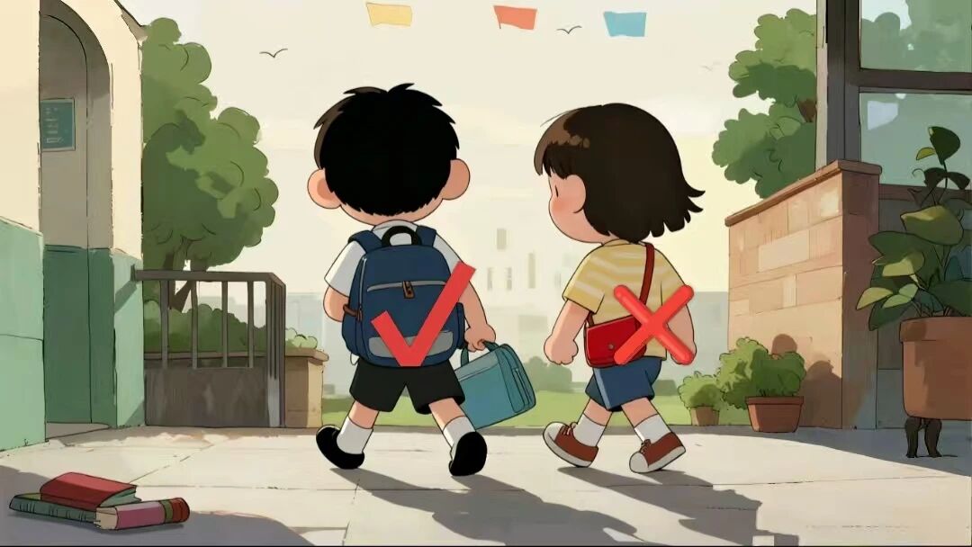 调整好肩带长度,让书包紧贴背部,避免单肩背或把所有重物都塞在书包一侧,减少脊柱受力不均。
