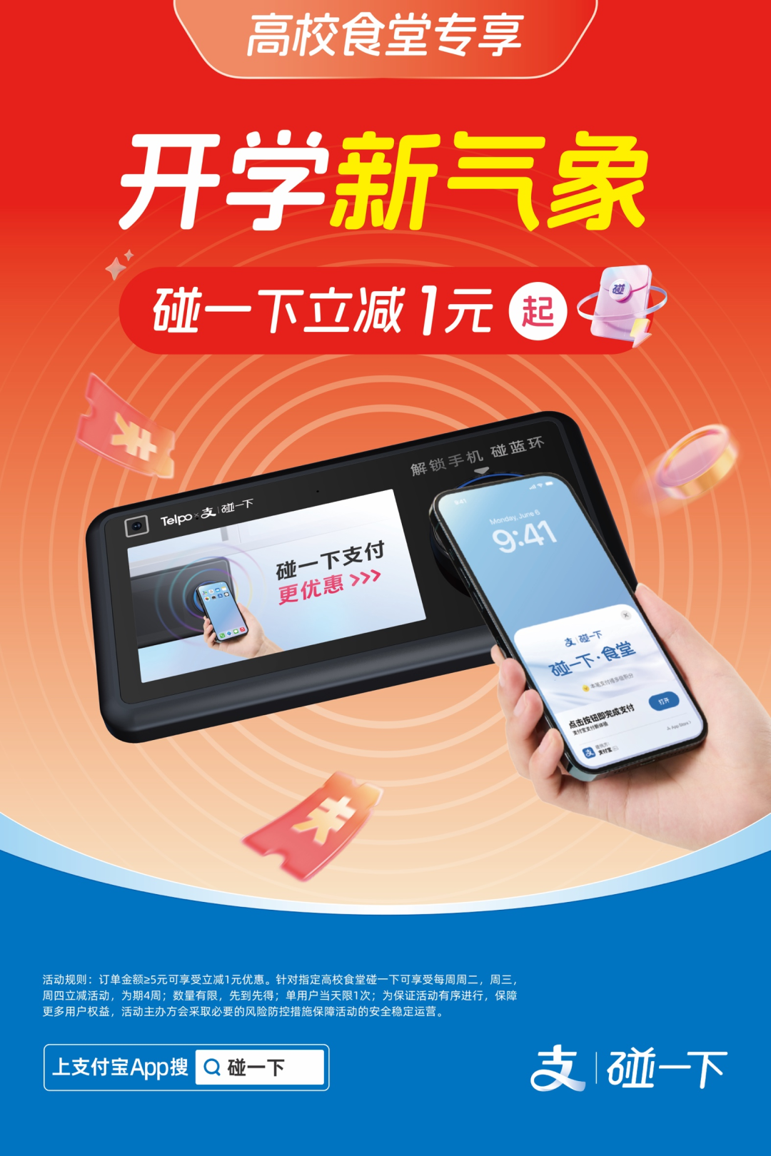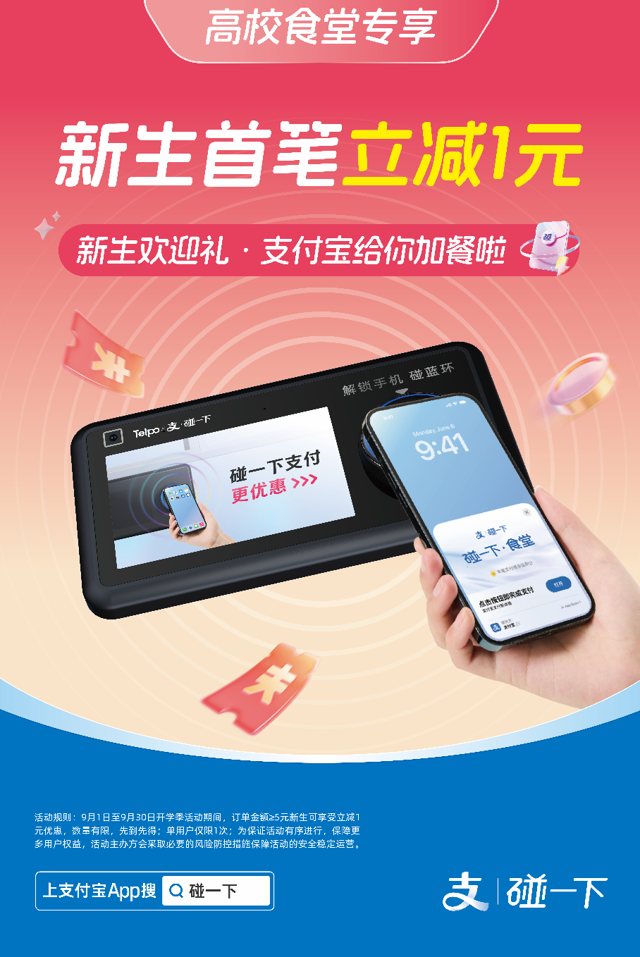 2025级小萌新们,在燕理餐厅使用支付宝“碰一下”完成首笔支付,即可享受立减1元优惠!