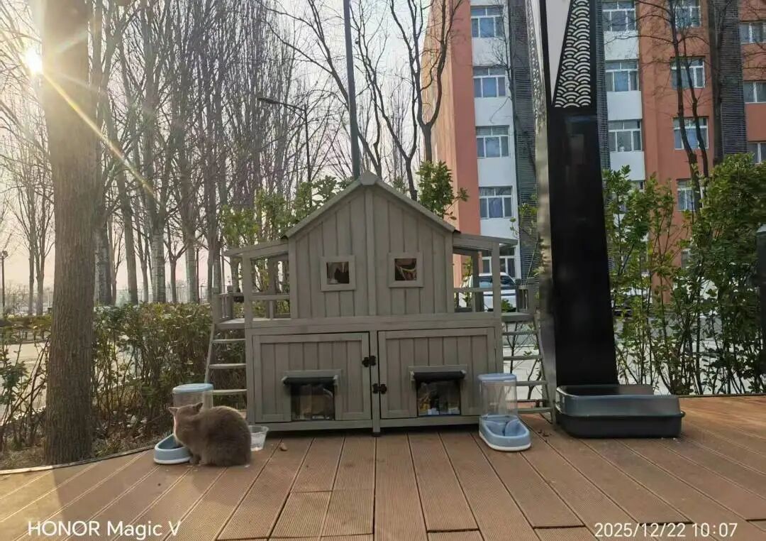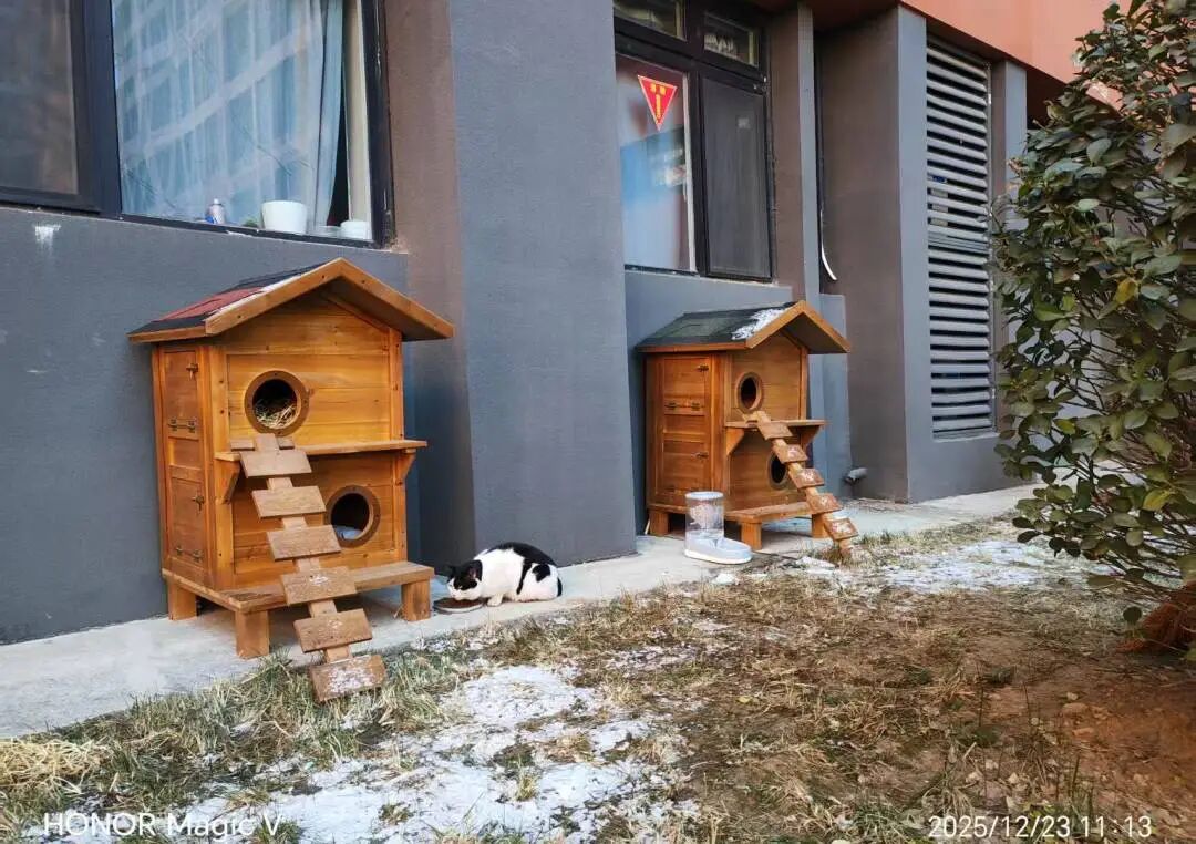 此次购置的猫窝均采用防水、保暖材质,能够有效抵御冬日的严寒和雨雪天气。后勤经过多次实地考察,结合猫咪的活动轨迹,将猫窝精心安置在校园绿化带、宿舍楼周边等相对安静、安全的区域,既避免了对师生日常通行造成影响,也能让猫咪安心栖息。